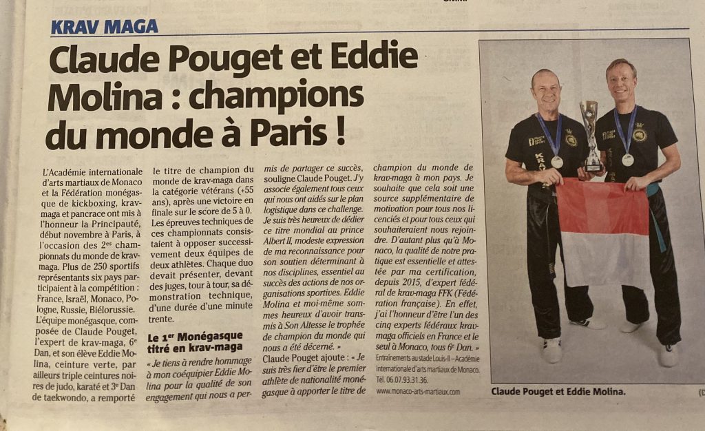 Claude Pouget et Eddie Molina, (Monaco) Champions du Monde de Krav-Maga 2019 3 novembre 201918 mars 2026Krav-maga compétition